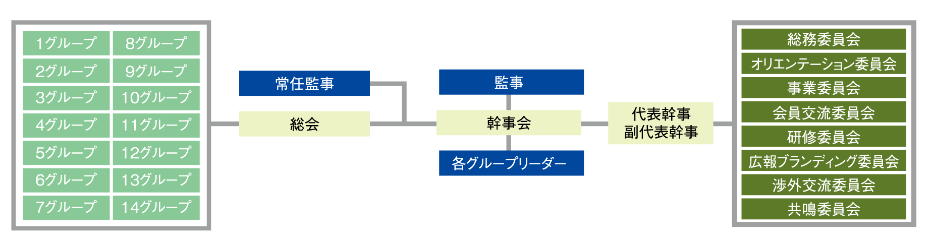 組織紹介 Introduction 組織図 年度ごとに代表幹事が「年間テーマ」を示し委員会がテーマを具現化するため、それを専門的に実施する組織として7つの委員会、そして主な活動の場となるそれぞれ14のグループが代表幹事のもと現在活動しております。 グループについて 個性の異なる14のグループに分かれ、交流と研鑽を深めています。 グループ一覧 研究会・サークルについて 専門的テーマを研究する研究会、趣味を軸に活動するサークルで仲間との交流を深めています。 研究会・サークル一覧